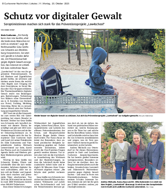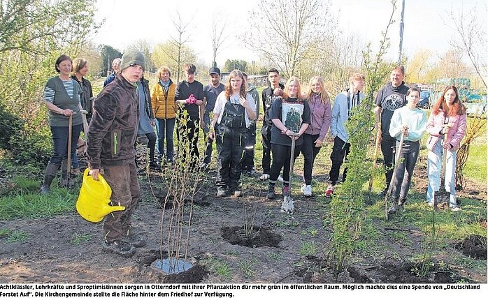 Anlässlich des 100. Geburtstags der weltweiten Organisation berufstätiger Frauen hat Soroptimist International alle Clubs dazu aufgefordert, unter dem Motto Bäume pflanzen für die Zukunft (#PlantTrees) unterschiedliche Bäume zu pflanzen. Der SI Club Cuxhaven Stadt und Land hat sich an dieser Aktion beteiligt, drei Bäume gesponsert und diese zusammen mit einer siebten Klasse der Hauptschule Otterndorf hinter dem Friedhof gepflanzt. „Wir möchten Menschen unterschiedlichen Alters in einem langlebigen Projekt zusammenbringen. Die Bedeutung von Bäumen für den Lebensraum der Menschen soll dabei direkt erfahrbar werden“, so die Planerinnen des Projekts von SI Cuxhaven Stadt und Land Renate Augstein, Karin Riemer, Silke Eulenstein und Silke Müller.